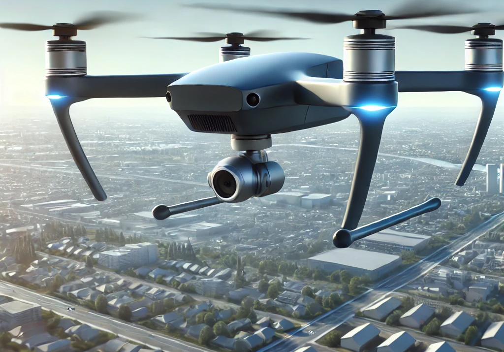 An illustration of a modern drone flying in the sky.The drone has four propellers and a sleek design hovering above a city with a clear sky