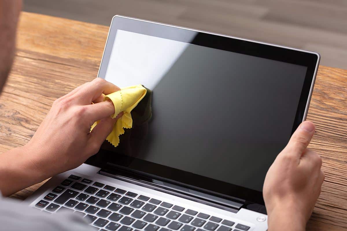 Gunakan kain microfiber yang sedikit dibasahi alkohol isopropil untuk membersihkan permukaan casing, layar, keyboard, dan mouse. Hindari menggunakan cairan berlebihan agar tidak merusak komponen. -