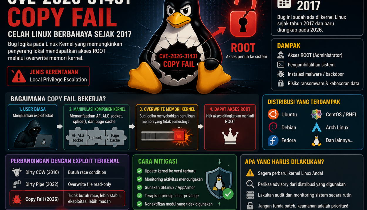 CVE-2026-31431 “Copy Fail” menjadi salah satu kerentanan Linux yang cukup serius karena memungkinkan attacker memperoleh akses root dengan metode yang relatif mudah.