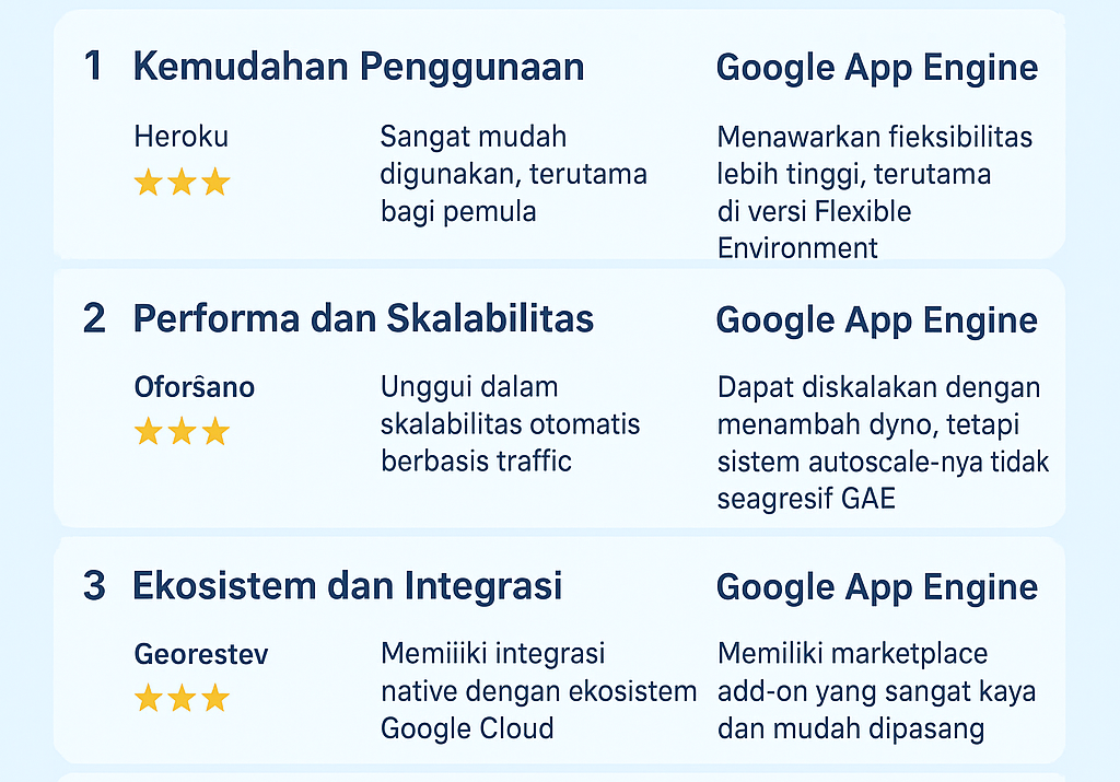 GAE menawarkan fleksibilitas lebih tinggi, terutama di versi Flexible Environment. Namun, setup awalnya sedikit lebih kompleks dibanding Heroku. Meskipun demikian, integrasinya dengan layanan Google Cloud mempermudah pengelolaan aplikasi skala besar.